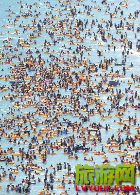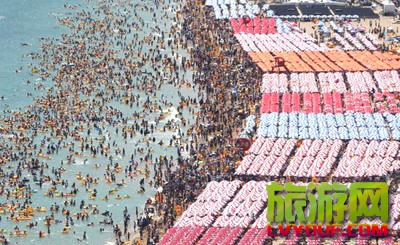 当地时间2009年8月2日,韩国釜山海云台海水浴场,民众纷纷涌向这里来度假,十分拥挤。