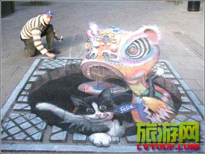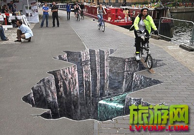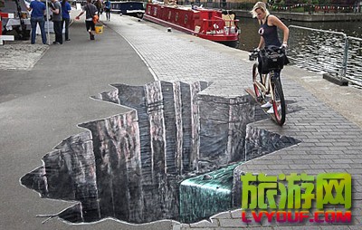 一幅三维的峡谷涂鸦作品在伦敦摄政运河边的街道上亮相 市民骑车从“大峡谷”上的独木桥上跨过 “大峡谷”实在太逼真,只敢微微探头观望  据英国媒体报道,一幅三维的峡谷涂鸦作品在伦敦摄政运河边的街 ...