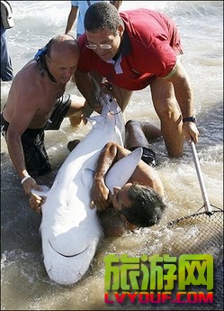 西班牙潜水员8月20日在西班牙塔拉戈纳省一海滩附近捕到了一条体长达2米的沙锥齿鲨(grey nurse shark)。   据法新社8月20日报道,据巴塞罗那水族馆女发言人介绍,这条鲨鱼是进入位于西班牙东北部塔拉 ...